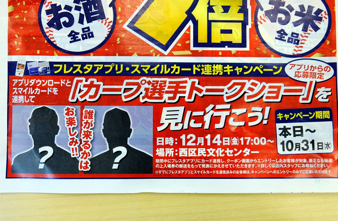 フレスタのキャンペーンで12/14(金)の「カープ選手トークショー」の入場券ゲット!
