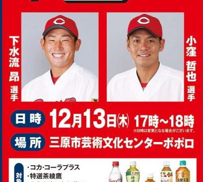 コカ・コーラとフレスタのコラボ企画として、12月13日(木)17:00~18:00に三原市芸術文化センターポポロで「カープ選手トークショー」が予定されているようです。コカ・コーラの対象商品2本を含む1,000円以上の商品を購入し、レシートを...