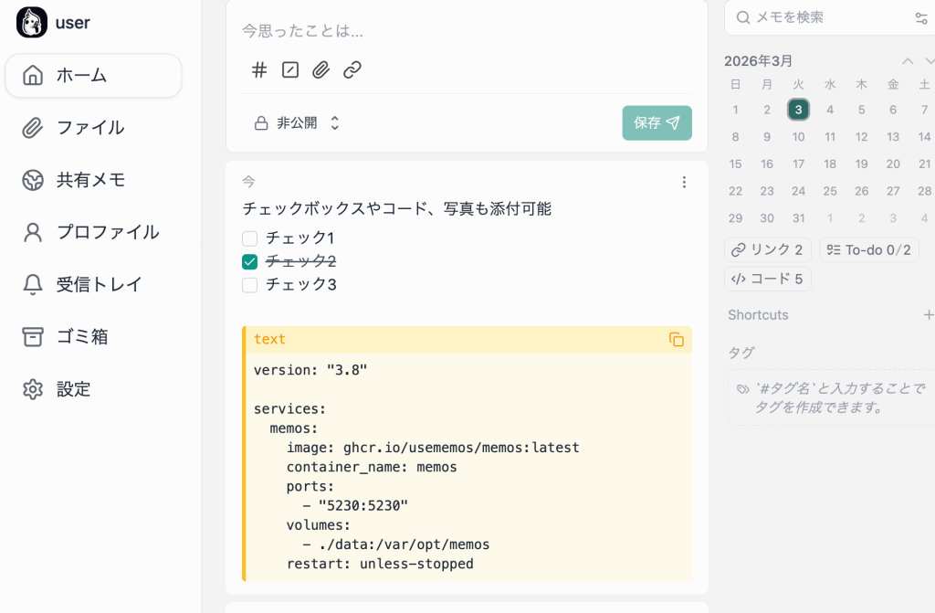 Google KeepやSimplenoteのような軽量なメモサイトを自前で用意します。メリットは軽量で高速、データを自身で管理出来る点です。 DockerでM…