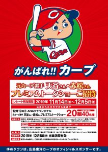 「ひろしま駅ビルASSE」では、4Fのアッセホールで11:00より松山 竜平選手、會澤 翼捕手のトークショーが行われる予定です。観覧は無料ですが、会場の広さの関係で入場できるのは先着約140名となります。整理券の配布は無く、来場者多数の場合は観覧出来ない場合もあるとのこと。また開場は10:00予定ですが、状況により早く開場する場合もあるそうです。詳細はASSEのイベントページで確認出来ます。