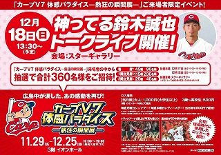 イオンモール広島府中で行われる「神ってる 鈴木誠也 トークライブ」は、「カープV7体感パラダイス」来場者の中から抽選で合計360名様が優先招待されるそうで、抽選は本日12月17日(土)10:00~19:00と、明日12月18日(日)10:00~12:00の予定です。また打劇王 草津店で行われる「広島東洋カープ選手サイン会&トークショー」の整理券は明日12月18日(日)9:00~。広島市内からは少し離れていますが、三次ショッピングセンターでは明日12月18日(日)14:00~の「一岡 竜司選手トークショー!」がありますね。