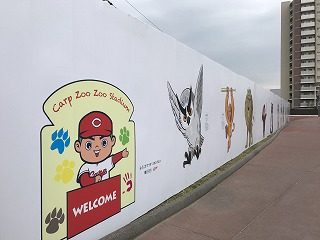 プロムナードとカープロードをつなぐ「カープウォール」がリニューアルしたそうなので、見に行ってみました。「Carp Zoo Zoo Stadium」と題され、動物になった選手たちが登場します。