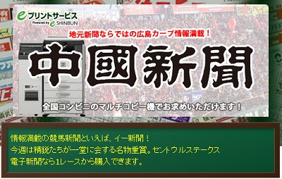 全国のコンビニで競馬新聞や競輪新聞、スポーツ紙、地方紙をプリントアウト出来る「eプリントサービス」に、広島県を中心に中国地方で発行される地方紙「中国新聞」も対応…