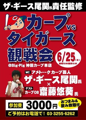本日6/25(日)Big-Pig神田カープ本店でザ・ギース尾関さんとカープOB齋藤悠葵さん参加の観戦会開催!