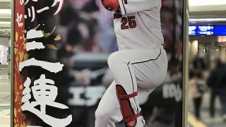 広島駅南口の地下通路にある柱に「三連覇」の文字と共にカープ選手の写真が!