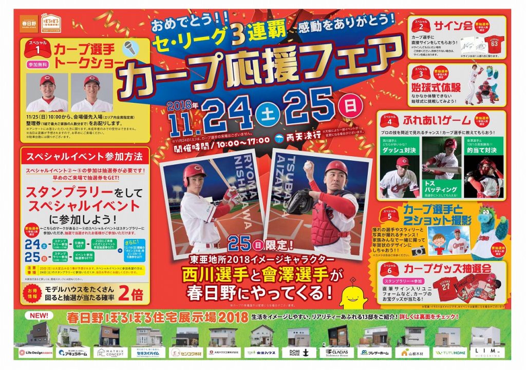 11月24日(土)と11月25日(日)の2日間、広島市安佐南区にある「春日野ぽるぽる住宅展示場」で「カープ応援フェア」が開催されます。會澤捕手と西川選手のトーク…