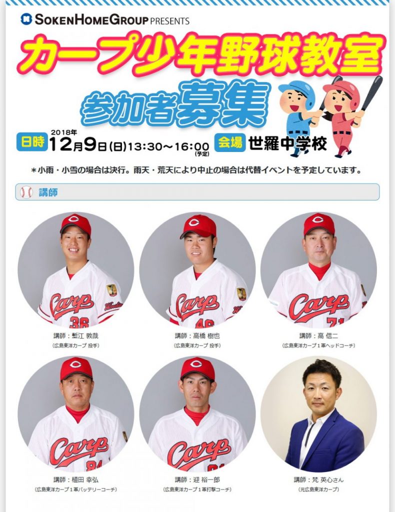 12月9日(日)に、世羅郡にある世羅中学校で「創建ホームグループプレゼンツ カープ少年野球教室」が開催されます。講師を務めるのは塹江敦哉投手や高橋樹也投手、高 …