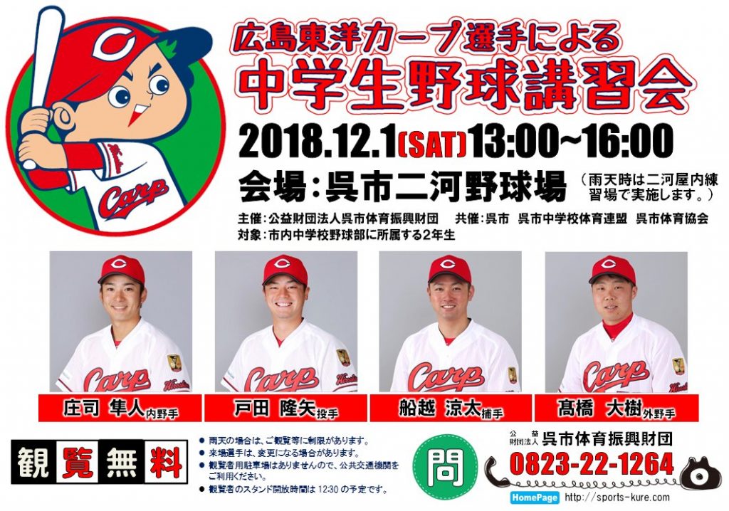 呉市二河野球場で12月1日(土)13:00から「広島東洋カープ選手による中学生野球講習会」が開催されます。参加するカープ選手は4名。庄司隼人選手、戸田隆矢投手、…