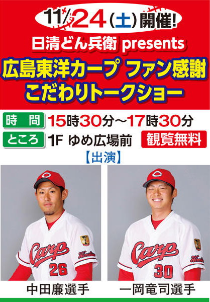 11月24日(土)にゆめタウン廿日市で中田廉投手と一岡竜司投手が出演する「日清どん兵衛 presents 広島東洋カープファン感謝こだわりトークショー」が開催さ…
