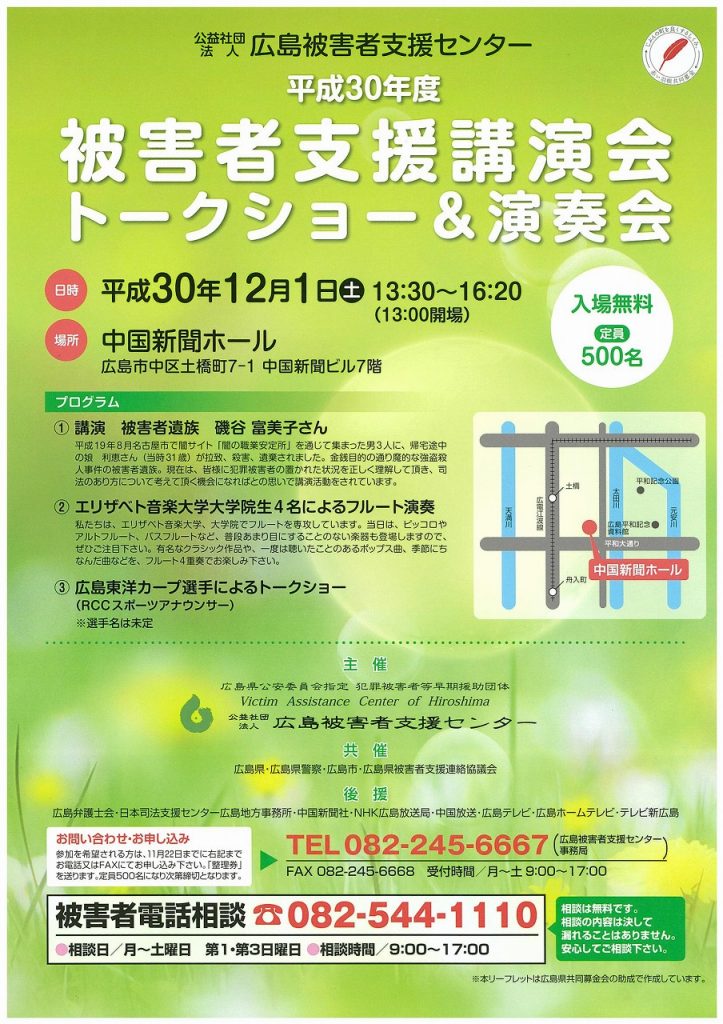 12月1日(土)13:00~16:10頃まで、「中国新聞ホール」で「犯罪被害者支援講演会 トークショー&演奏会」が開催されます。被害者遺族による講演のほか、エリ…
