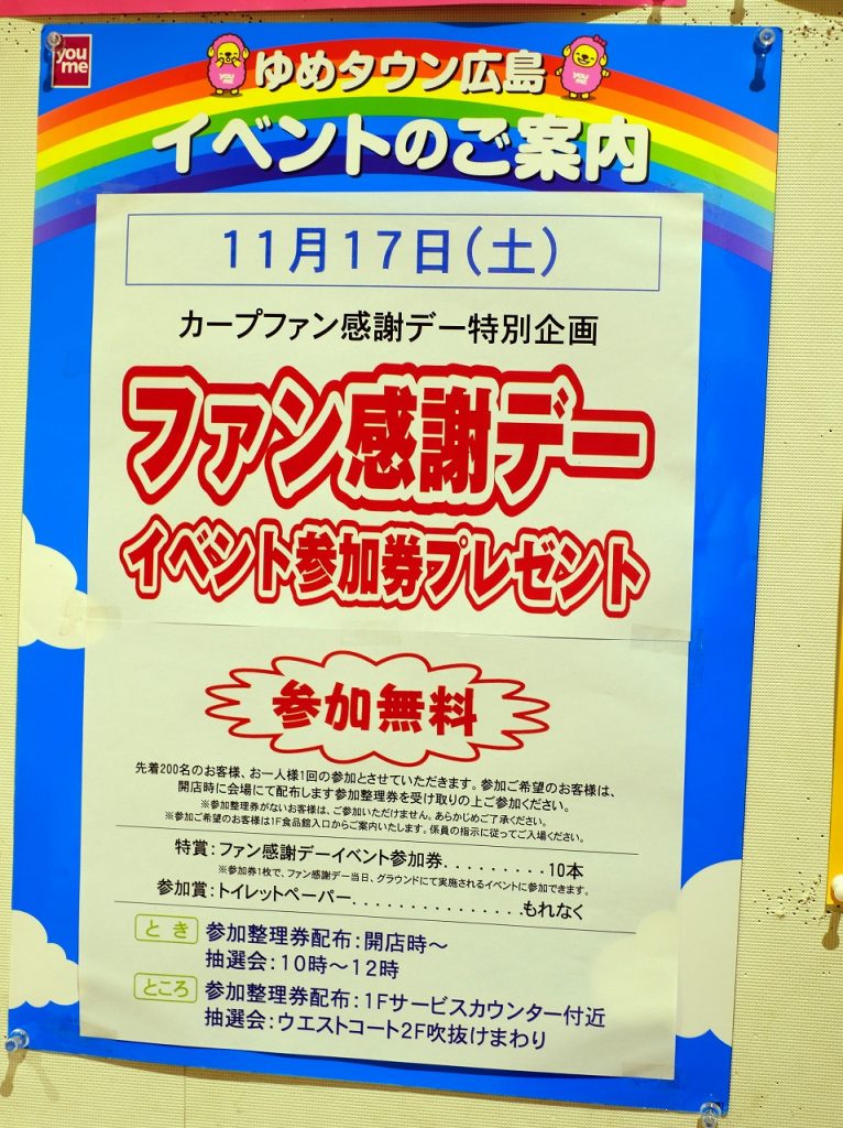 「ゆめタウン広島」で11/17(土)にカープファン感謝デーのイベント参加券プレゼント企画開催!