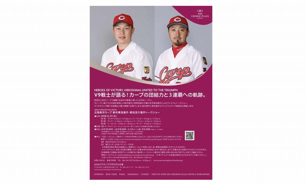 11月24日(土)に広島駅北口にある「ホテルガーデンパレス広島」で「カープ選手 スペシャルトークショー 2018」が開催されます。出演するのは九里投手と磯村捕手…