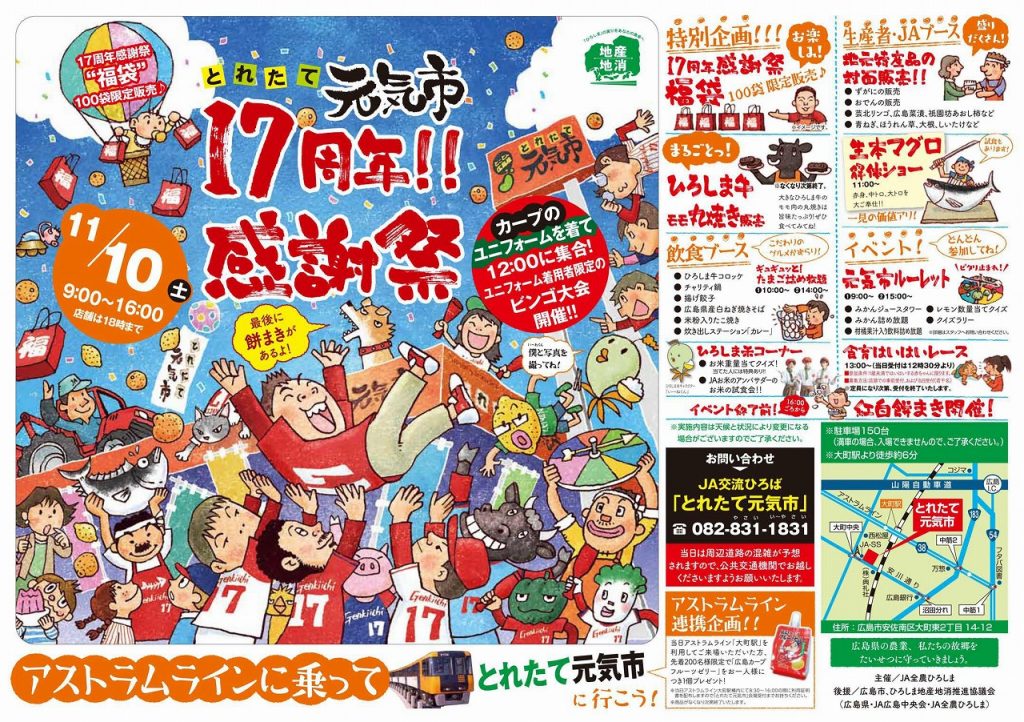 本日11月10日(土)に安佐南区大町にあるJA交流ひろば「とれたて元気市」で「とれたて元気市17周年!!感謝祭」が開催。先着100袋限定で「17周年感謝祭福袋」…