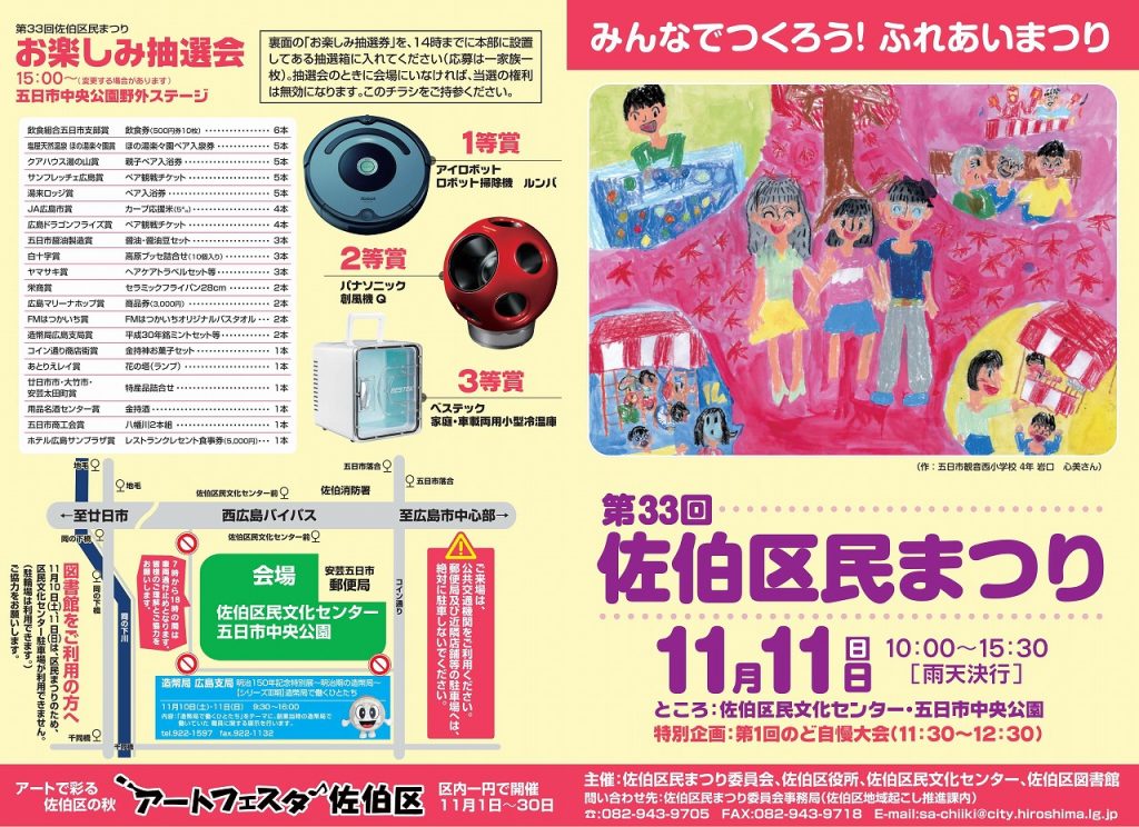 本日11月11日(日)に佐伯区民文化センターと五日市中央公園で「第33回佐伯区民まつり」が開催されます。なお広島市では毎年、西区・安佐南区・安芸区・佐伯区で「区…