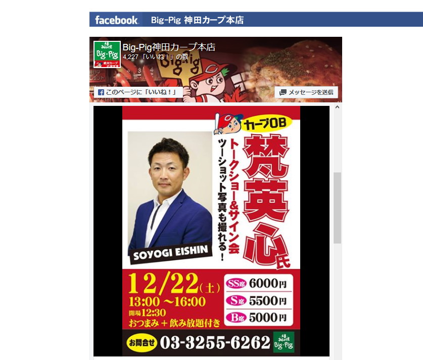 東京のカープファンが集うお好み焼き店「Big-Pig神田カープ本店」で、12月22日(土)にカープOBの梵英心さんを招いてトークショー&サイン会が開催されるそう…