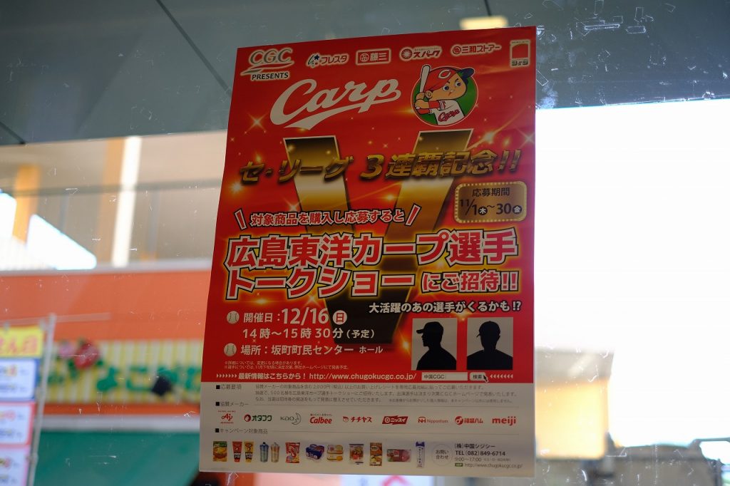 フレスタや藤三、スパーク、三和ストアー、西條商事等が加盟するCGCグループから、カープのセ・リーグ3連覇を記念し、「広島東洋カープ選手トークショー」 が12月1…