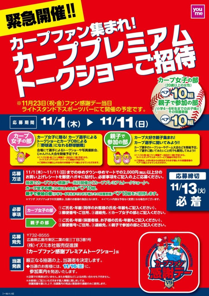 11月23日(金・祝)に開催される「カープファン感謝デー」。その中で行われる「プレミアムトークショー」へ抽選で招待するキャンペーンがゆめタウン・ゆめマートで開催…
