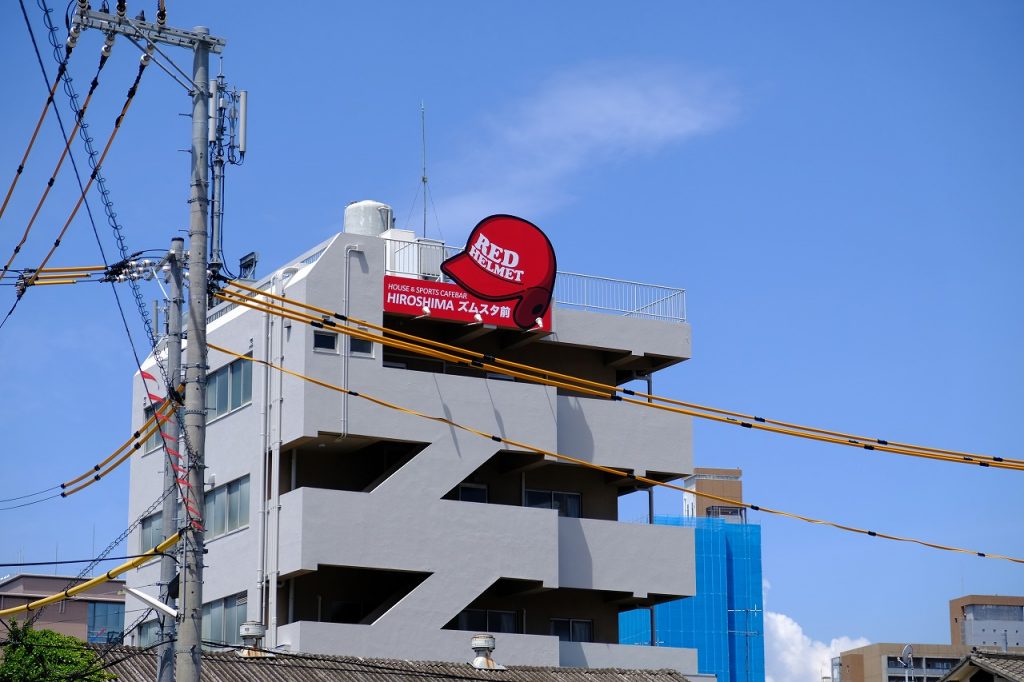 カープロードを歩きながら空を見上げると目に入る赤いヘルメット。4月にオープンした、カープ観戦が楽しめる屋台村「スポーツファンベースin赤ヘルツイン」のビルです。…