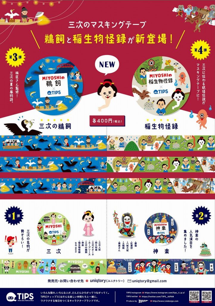 先日発売された「菊池ボトル」のイラストでも有名なTIPSから、「三次の鵜飼」や「稲生物怪録」のマスキングテープが登場しました。 広島県北部に位置する三次市。三次…