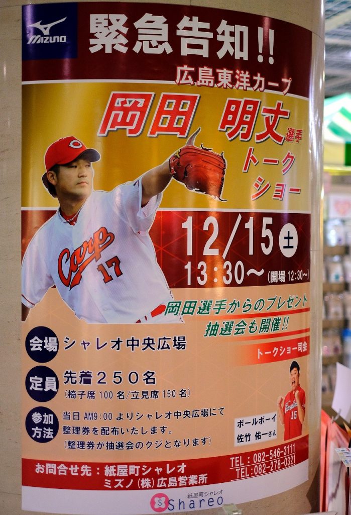 先日より緊急告知として、紙屋町シャレオ中央広場に案内ポスターが貼られていましたが、12月15日(土)13:30~14:30に「Shareo 広島東洋カープ 岡田…