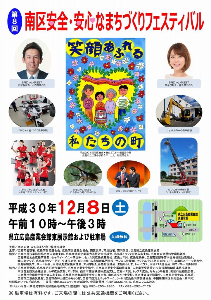 明日12月8日(土)に広島県立広島産業会館東展示館やその駐車場で、「みんなで交通安全・防犯・防災を考えよう」をテーマとした「第8回 南区安全・安心なまちづくりフ…