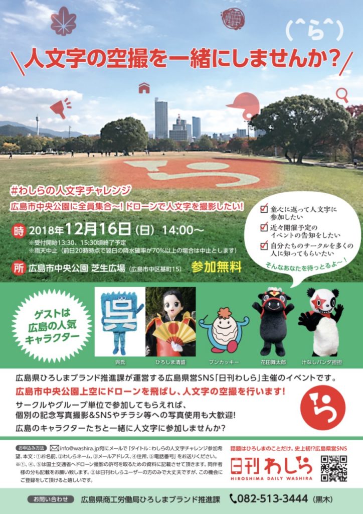 ひろしま県営SNS「日刊わしら」の企画として、12月16日(日)に広島市中央公園で人文字の空撮イベントが予定されており、現在はその参加者を募集しています。 当日…