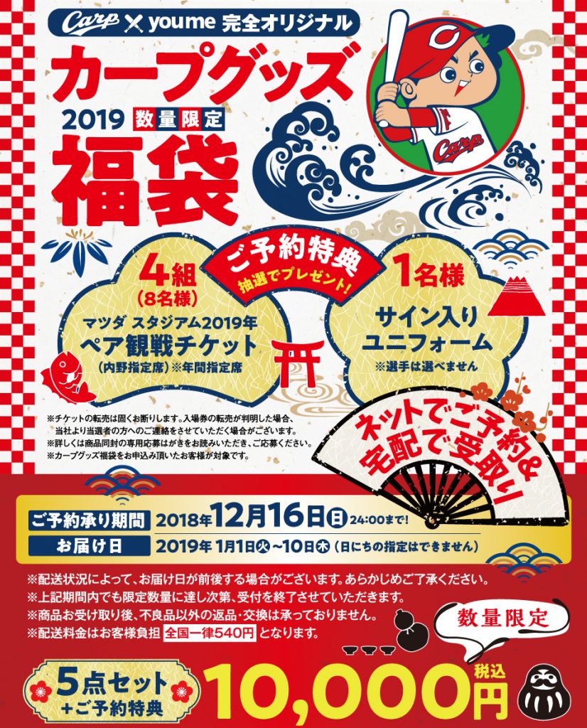 観戦チケットも当たる!?ゆめタウンの「 カープグッズ福袋2019」予約受付は12/16(日)まで