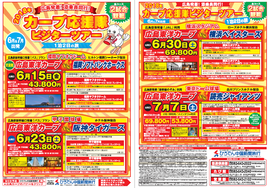 広島電鉄と中国新聞社が出資して設立された「ひろでん中国新聞旅行」で現在「カープ応援隊ビジターツアー」の申込が行われています。現在受け付けているのは6月・7月出発…