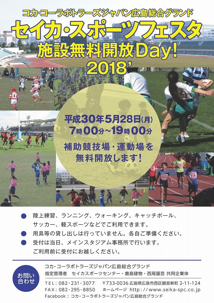 5月28日(月)に、広島市西区観音新町にあるコカ・コーラボトラーズジャパン広島総合グランドで「セイカスポーツフェスタ」が開催されます。当日は7:00~19:00…