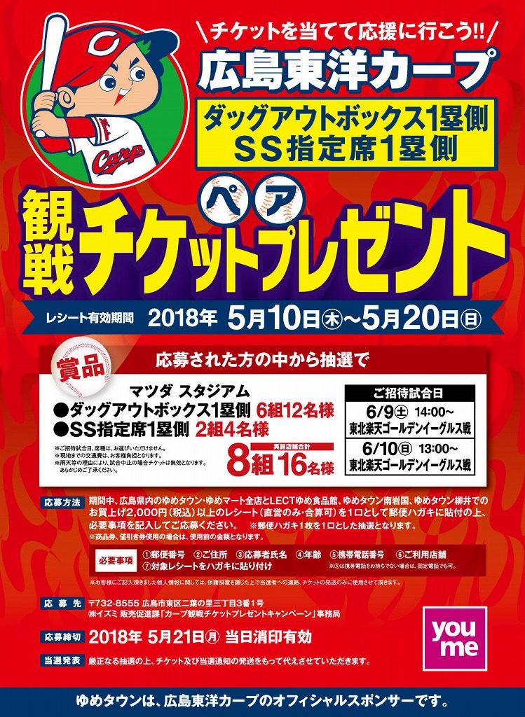 ゆめタウンでカープ観戦チケットが当たるキャンペーンを実施中!5/21(月)締切と5/31(木)締切の2種類