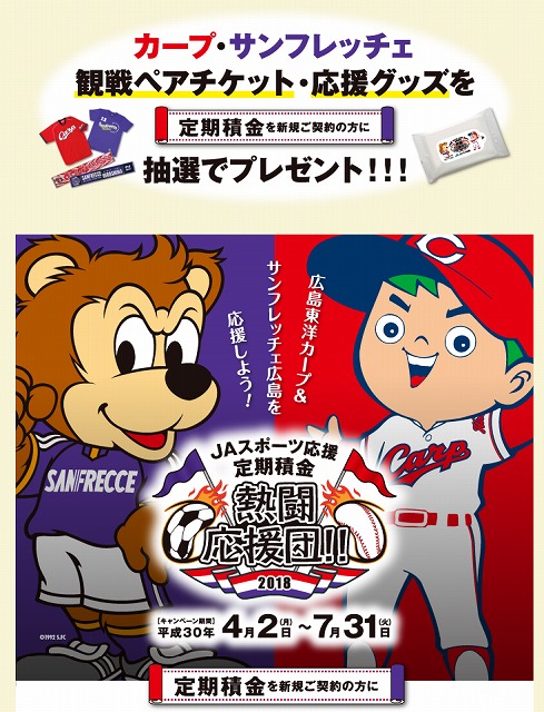 カープ・サンフレッチェの観戦チケットや応援グッズが当たる、JAバンクのスポーツ応援定期積金「熱闘応援団!! 2018」が本日4月2日(月)~販売が開始されます。…