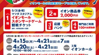 「イオンモール広島府中」や「イオンモール広島祇園」、「広島段原ショッピングセンター」、「ジ・アウトレット広島」で、カープ観戦チケットや商品券が当たる「広島東洋カ … 続きを読む イオンモールやジ・アウトレット広島でカープチケットが当たる大抽選会!4/20(土)・21(日)