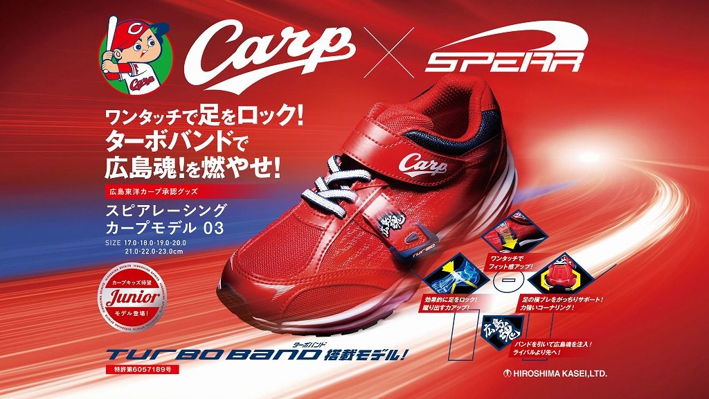 広島化成から、人気の子供靴「スピアレーシング」にカープとコラボしたデザインの「スピアレーシング カープモデル 03」が登場しました。 詳細は広島化成の商品ページ…