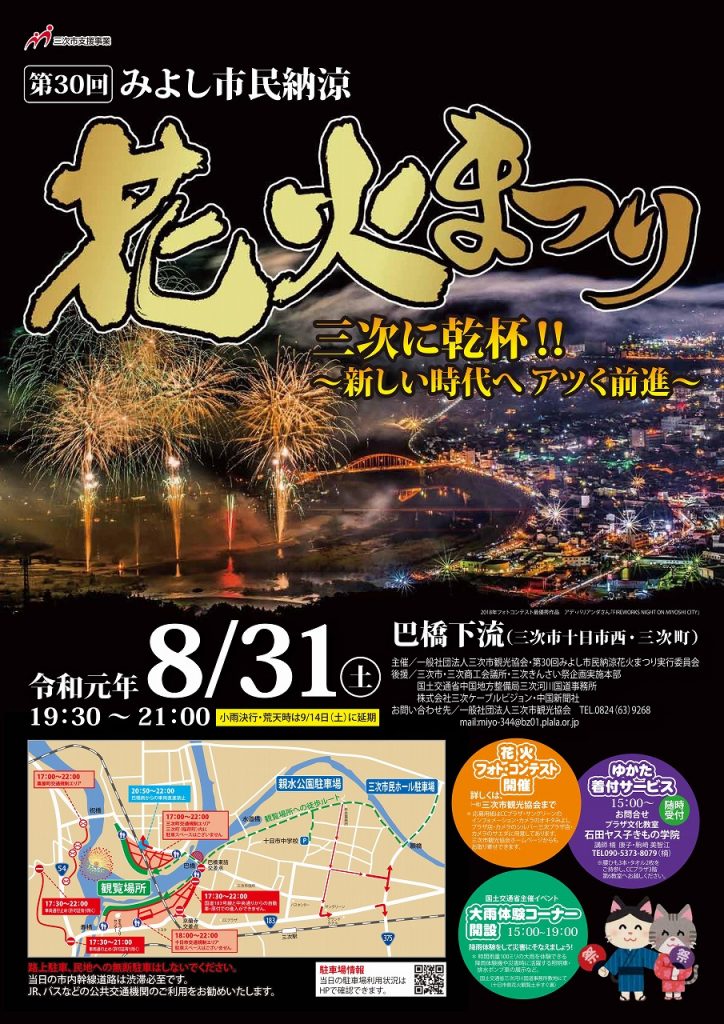 当初は本日8月31日(土)予定されていた三次市の「第30回みよし市民納涼花火まつり」は、大雨の影響で馬洗川周辺での準備が困難となり、9月14日(土)19:30~…