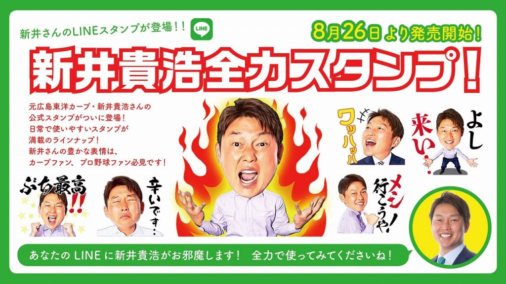カープOB新井さんのLINEスタンプ「新井貴浩 全力スタンプ!」登場!8/26(月)発売