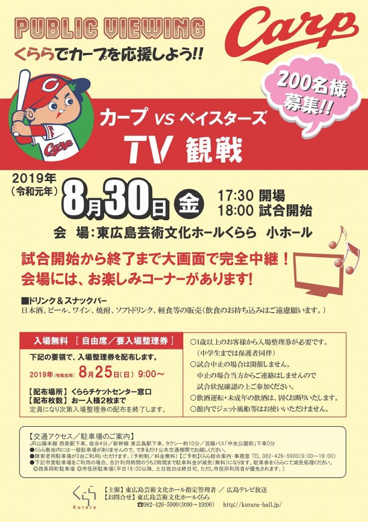 「東広島芸術文化ホールくらら」で8/30(金)にカープ戦パブリックビューイング!整理券は明日8/25(日)9:00~配布