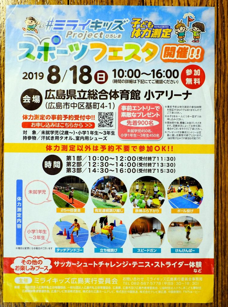 8月18日(日)10:00~16:00に、広島県立総合体育館(広島グリーンアリーナ)で、こども達を対象とした「スポーツフェスタ」が開催されます。 参加は無料で、…