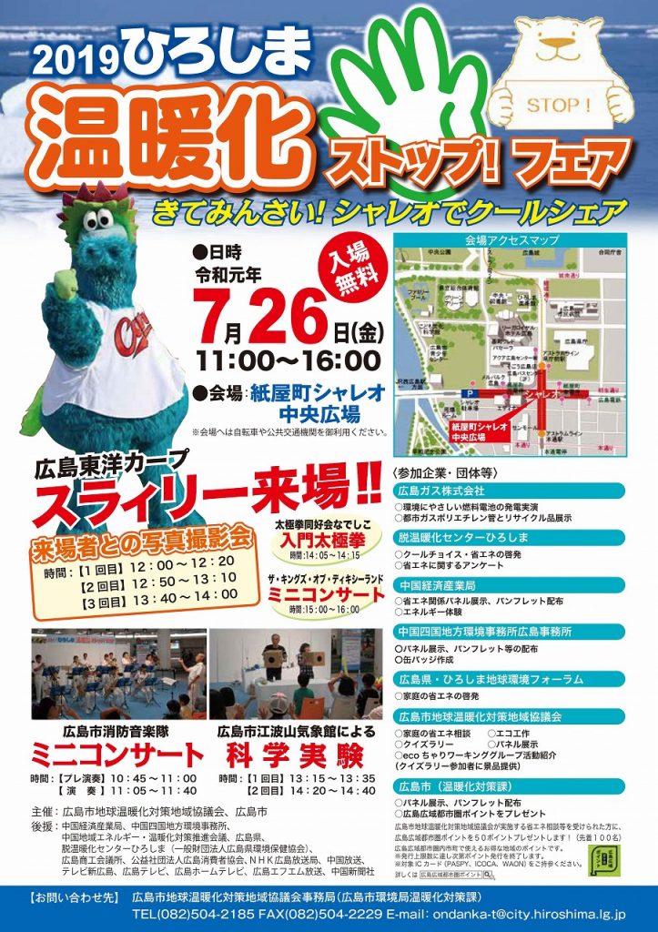 地球温暖化防止の取り組みを市民、事業者、関係機関・団体などが一緒に考えるイベント「2019ひろしま温暖化ストップ!フェア」が7月26日(金)に紙屋町シャレオ中央…