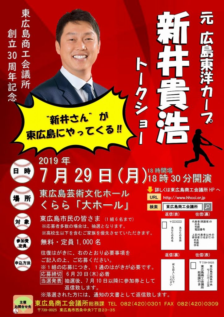 東広島商工会議所創立30周年記念イベントとして、7月29日(月)に東広島芸術文化ホールくららでカープOB新井貴浩さんのトークショーが開催されます。 参加費は無料…