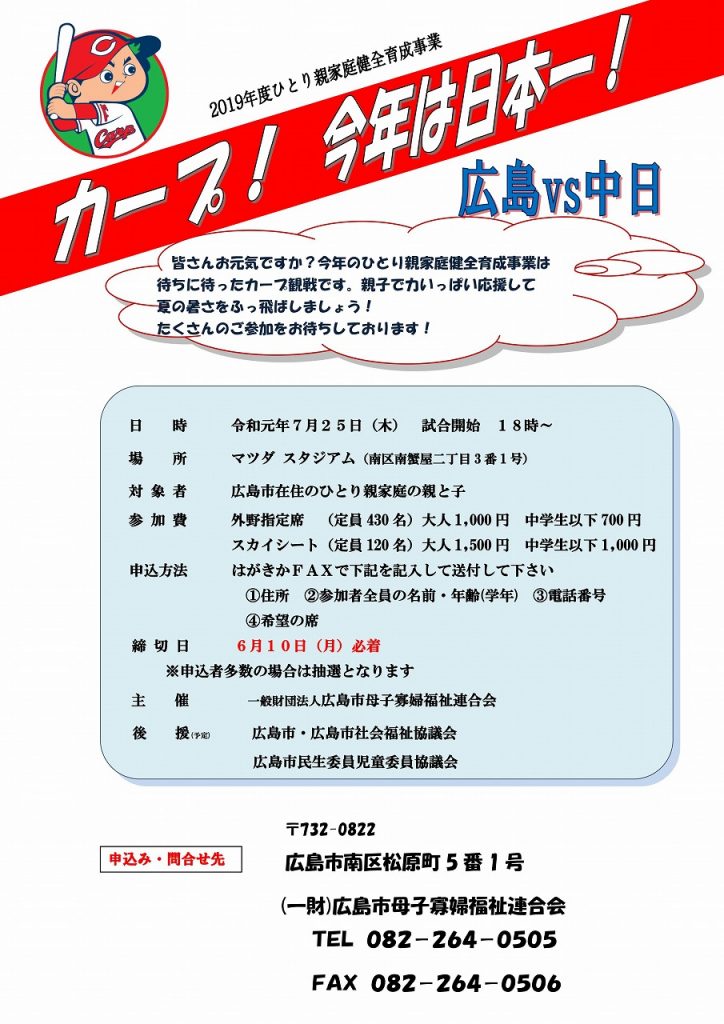 ひとり親家庭健全育成事業の一環として「カープ観戦/広島VS中日」参加者募集中!6/10(月)まで