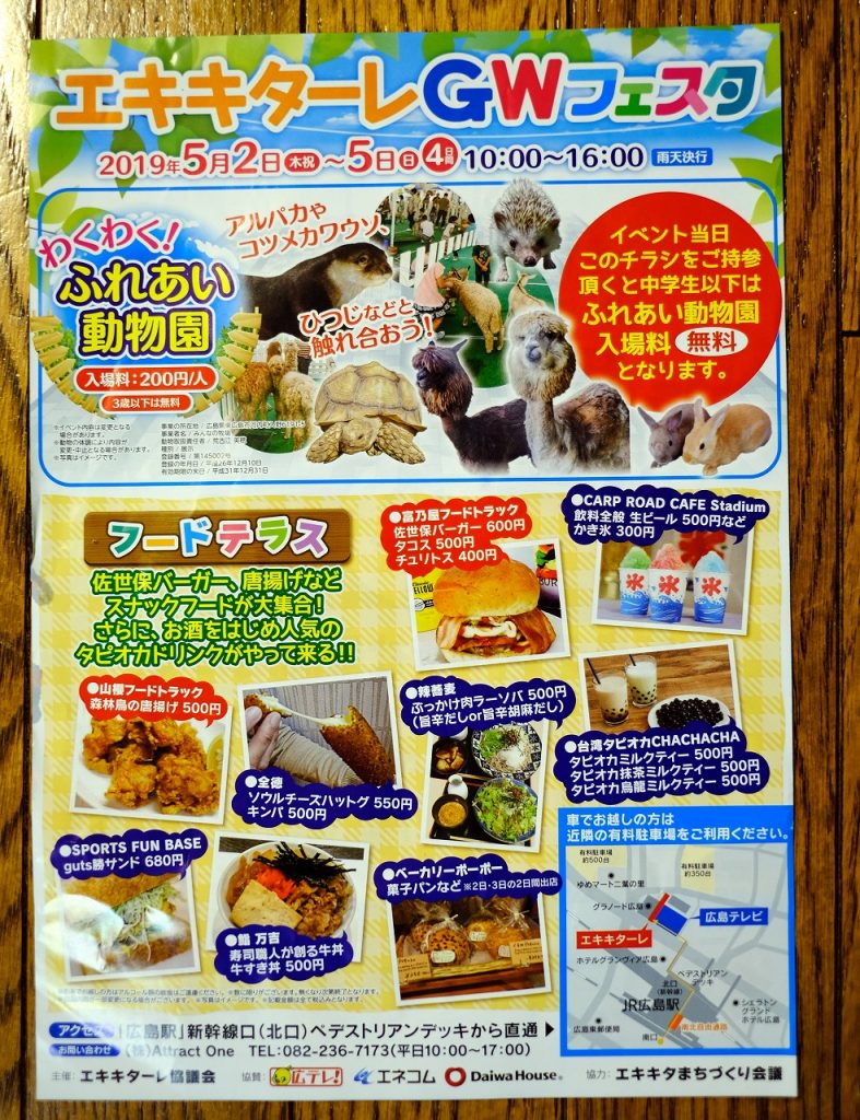 4月上旬に名称が公開された、広島駅北口の広島テレビ隣の広場「エキキターレ」で、本日5月2日(木・祝)~5月5日(日)の4日間、「エキキターレGWフェスタ」が開催…
