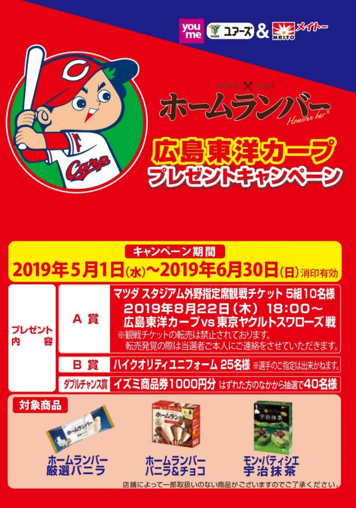イズミグループとメイトーの共同企画として「広島東洋カーププレゼントキャンペーン」が開催されています。これは「ホームランバー 厳選バニラ」、「ホームランバー バニ…