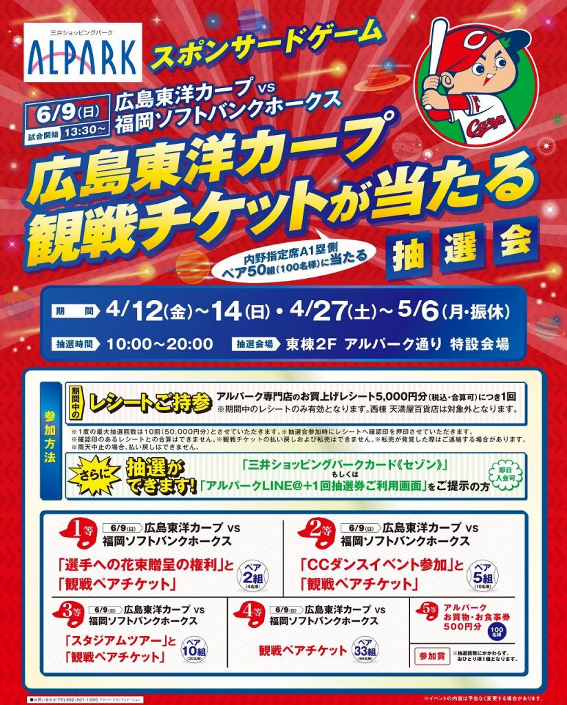 アルパークで「広島東洋カープ観戦チケットが当たる抽選会」開催!