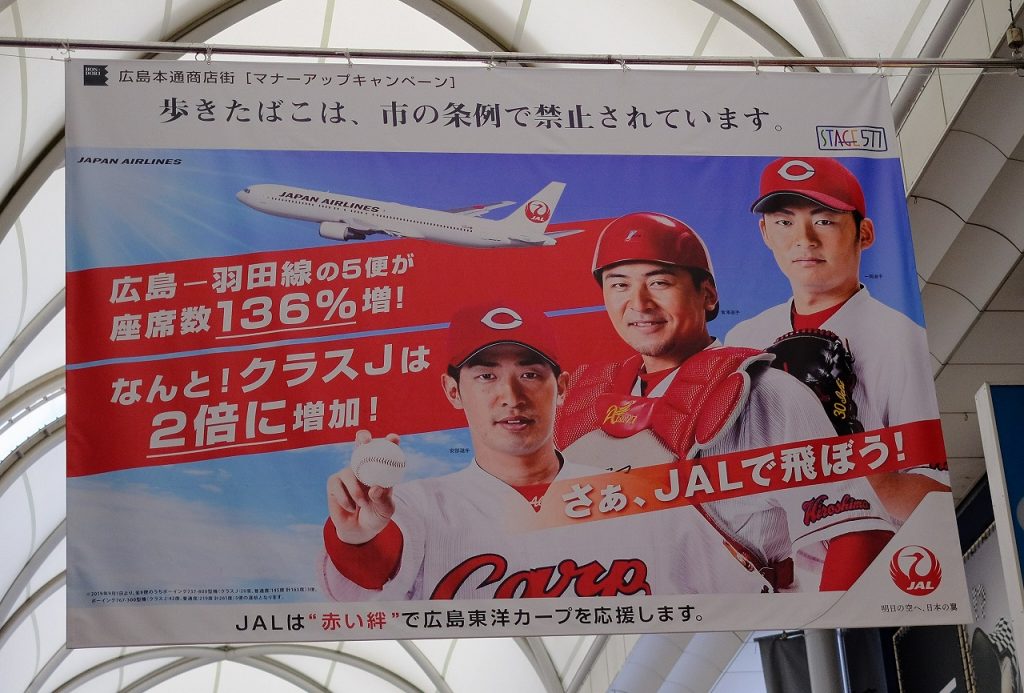 広島駅南口を出て真正面にある地下通路の柱。以前は「三連覇」の文字とともにカープ選手の写真が貼られていましたが、「ひろしまドリミネーション」の案内を経て、現在は広…