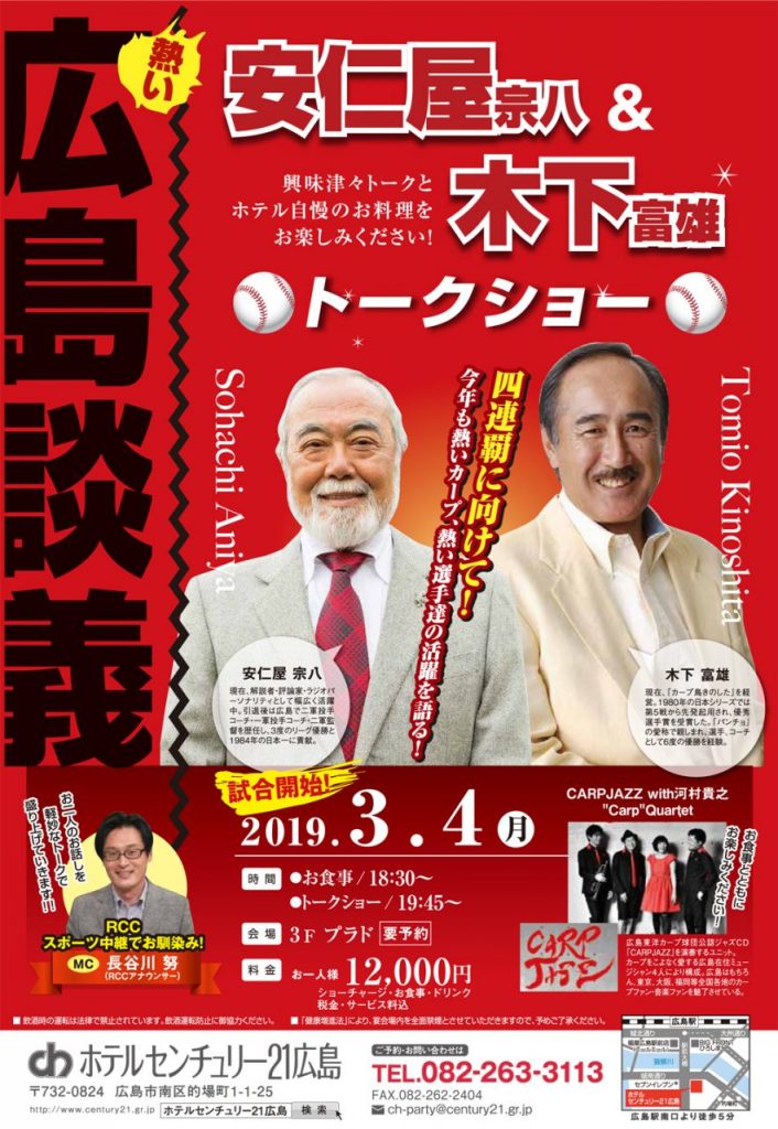 「ホテルセンチュリー21広島」で3/4(月)にカープOB安仁屋宗八さんと木下富雄さんによるトークショー開催!