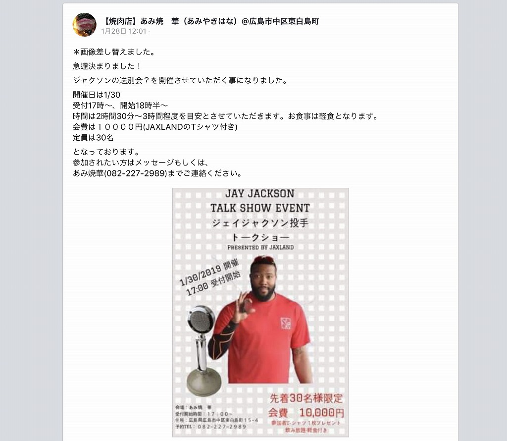 カープで活躍したジェイ・ジャクソン投手のトークショーが本日1/30(水)「あみ焼 華」で開催!