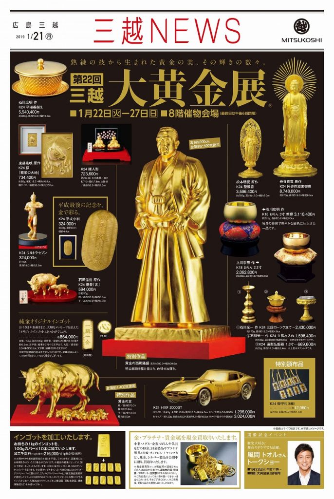 本日1/22(火)~広島三越で「第22回 三越 大黄金展」開催!風間トオルさんのトークショーも