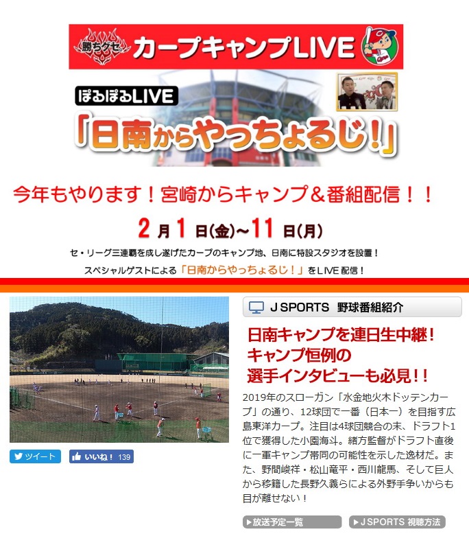 広島ホームテレビやJ SPORTSでカープ日南キャンプの様子をライブ配信/生中継!
