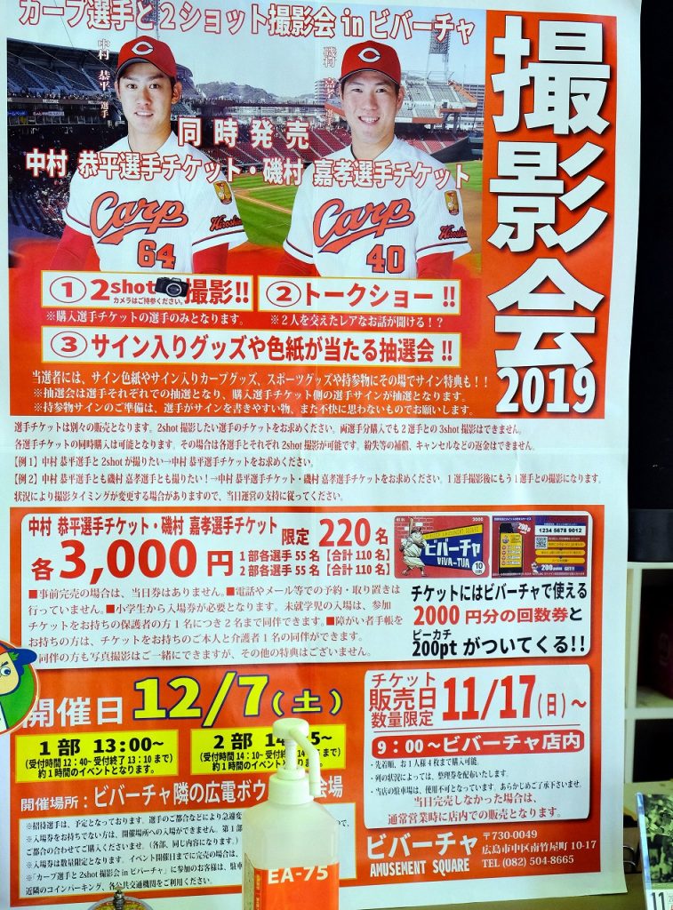 中区南竹屋町にあるアミューズメント施設「ビバーチャ」で、12月7日(土)に「カープ選手と2ショット撮影会 in ビバーチャ」が開催。今年は中村恭平投手と磯村嘉孝…