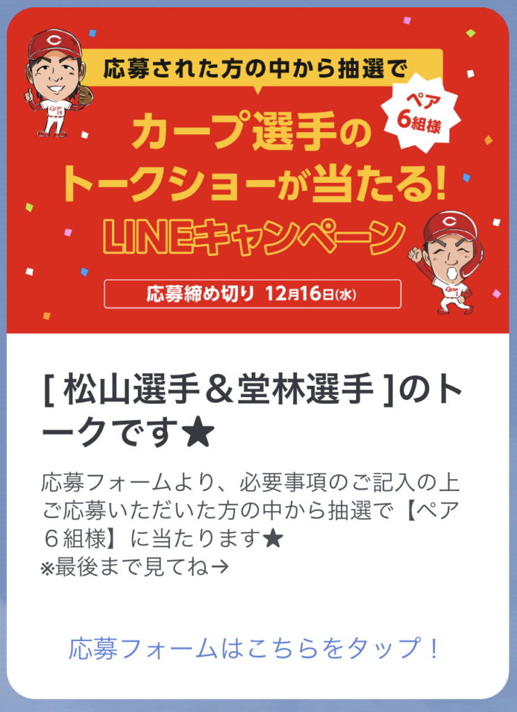 創建ホームでカープ選手のトークショーが当たるLINEキャンペーンが開催されています!開催日時は12月20日(日)に予定されている広島テレビ主催「2020カープフ…